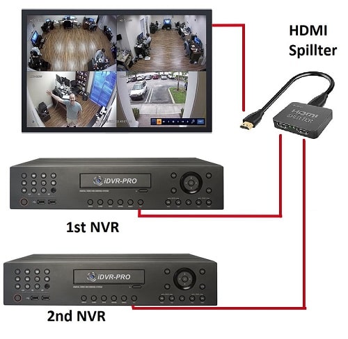 - همین کار را برای NVR دوم انجام دهید و خروجی HDMI آن را به ورودی دوم اسپلیتر وصل کنید.